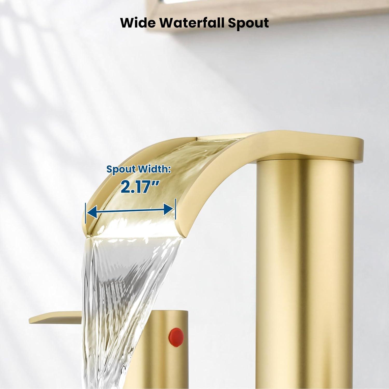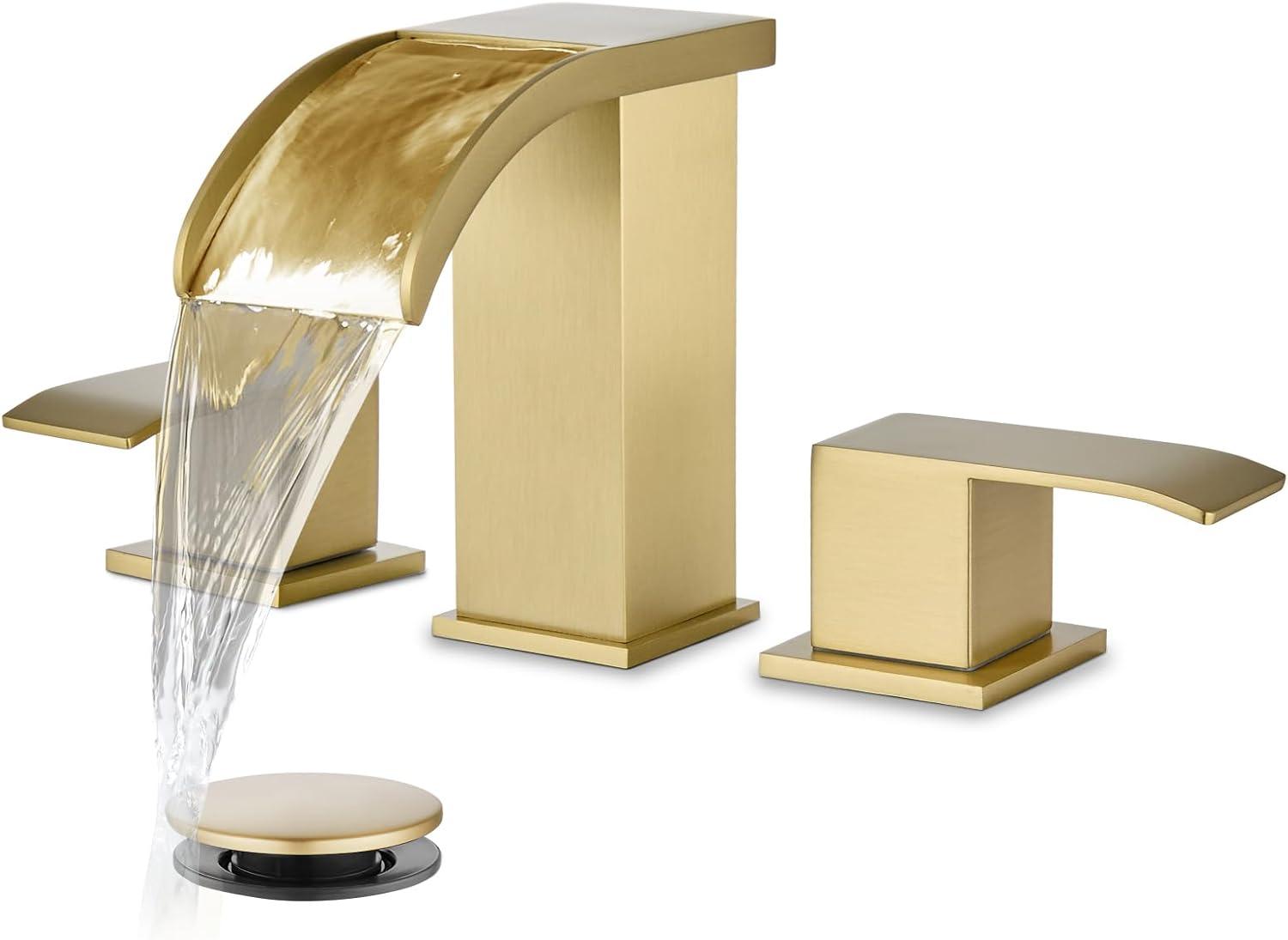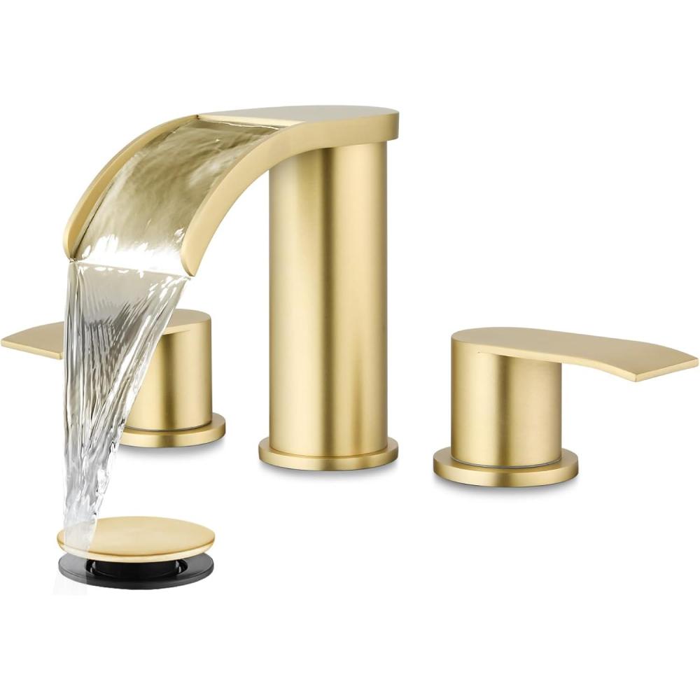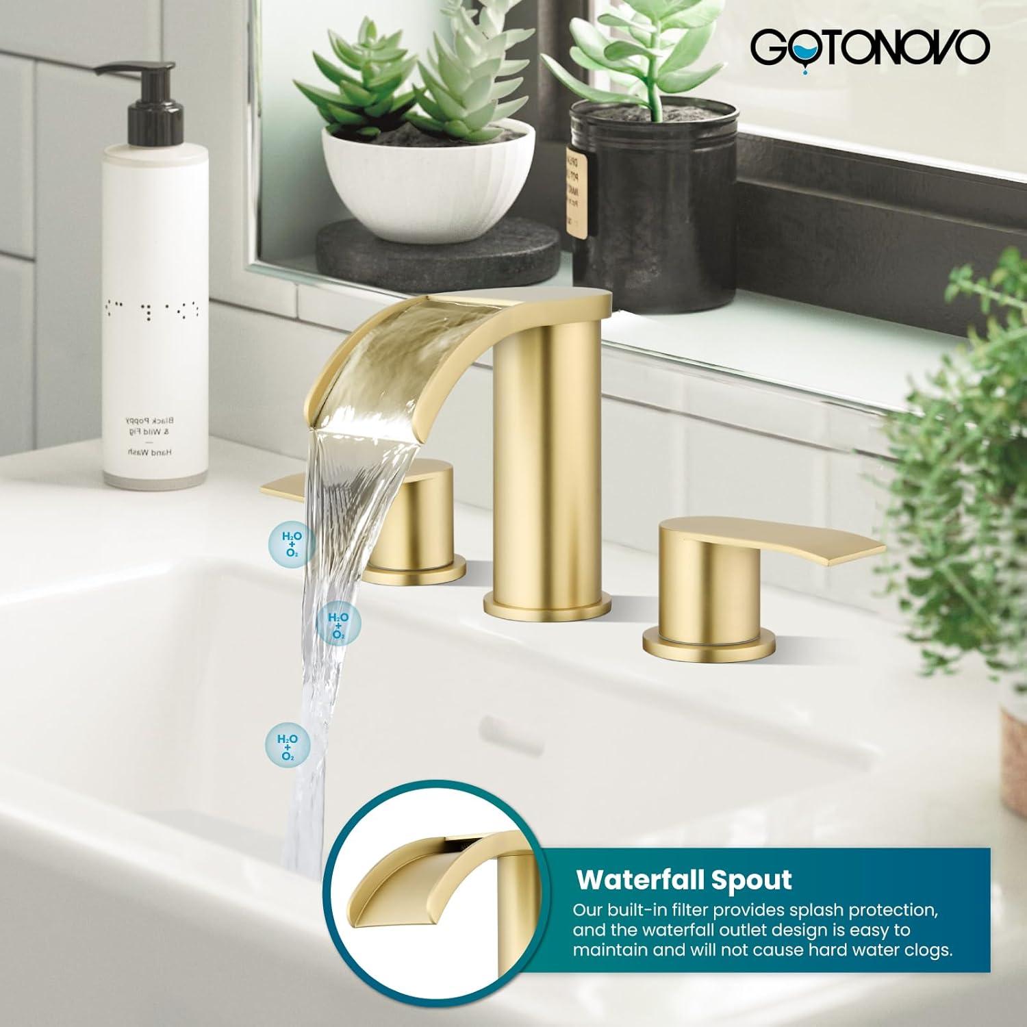 gotonovo Waterfall 8 inch Widespread Bathroom Faucet Set Bathroom Sink Faucet 3 Hole 2 Handle Vanity Lavatory Deck Mount with Pop Up Drain and Water Supply Lines Round Body Matte Black & Brushed Gold(Brushed Gold)