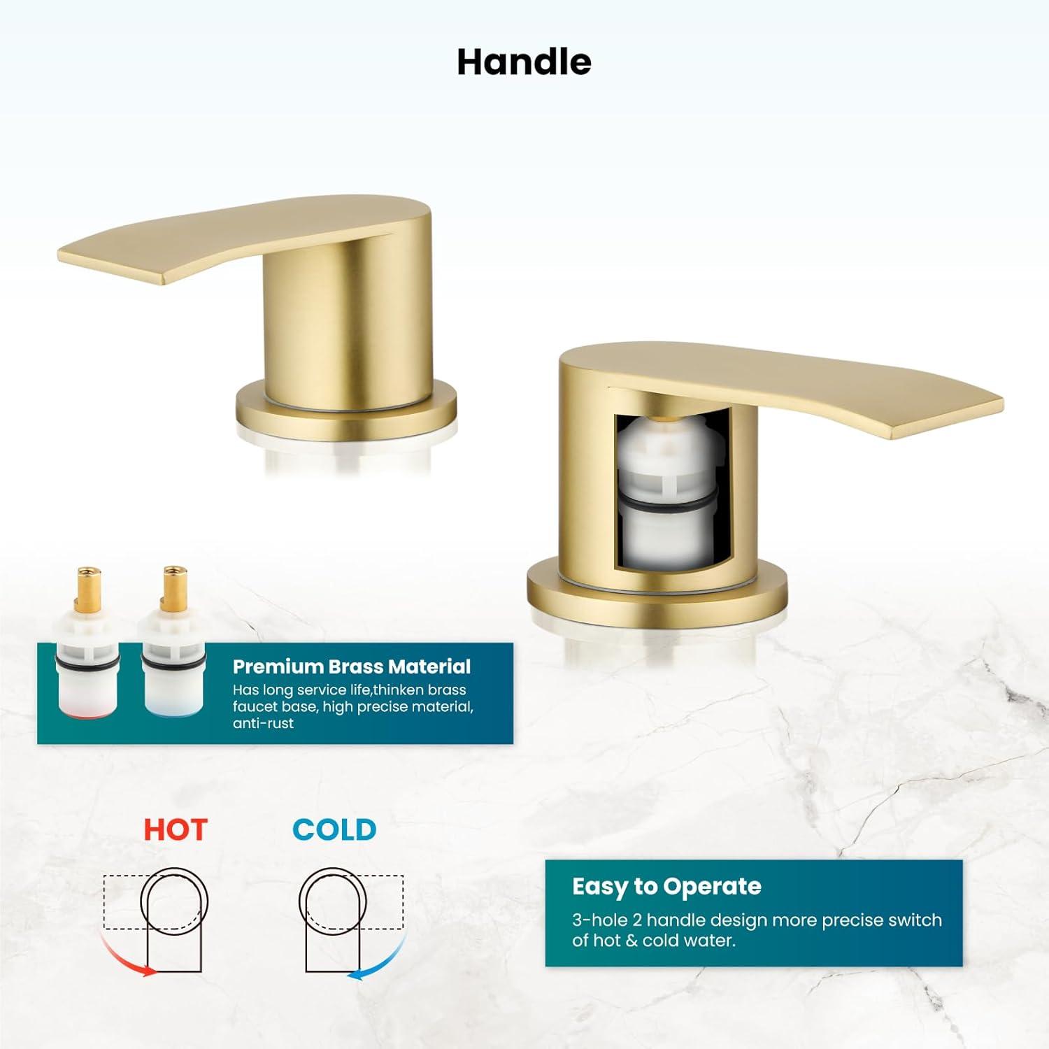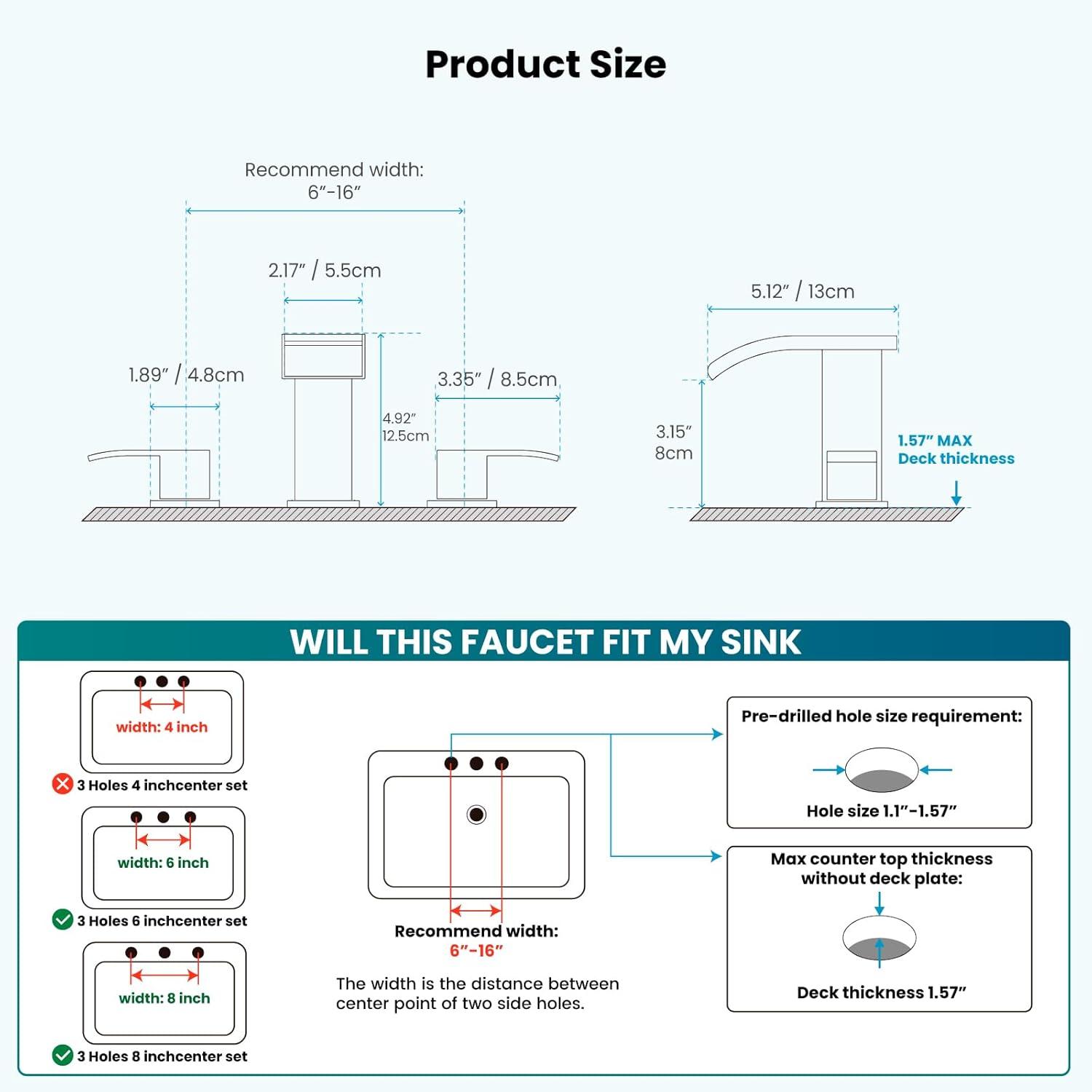 【Material】:Maximum Flow Rate:1.18gpm.4.5L/min.This deck mount vanity 8 inch widespread facuet is made from solid brass. Matte Black and Brushed Gold finish performs good in rusf-proof,corrision resistent.